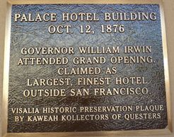 There were three Palace Hotels built following the discovery in 1872 of Silver in Mineral King (located in the high Sierras above Visalia). The first one was built in San Francisco, next Visalia then Porterville. The hotels provided lodging for investors in route to the silver mines. The Palace Hotel's upper story in Visalia remains essentially unchanged from the 1930s.
